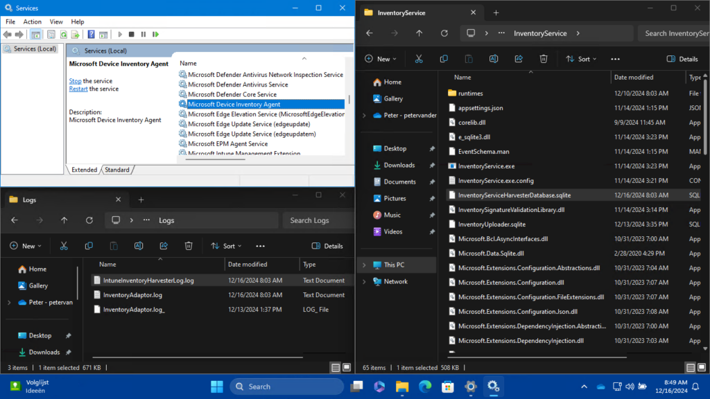 When the configuration for the additional hardware inventory properties is in place, it’s good to be familiar with the direct implications of that configuration. Especially, as there will be a new agent installed as part of the applied configuration. That agent will be installed in C:\Program Files\Microsoft Device Inventory Agent, as shown below in Figure 2. Within that folder will be the sources of the agent itself, including the logs that are generated by the agent. The inventory agent runs as a service named Microsoft Device Inventory Agent (InventoryService) on the Windows device and collects the data – mainly via WMI – locally in the InventoryServiceHarvesterDatabase. Eventually, that data is send to the Intune service.