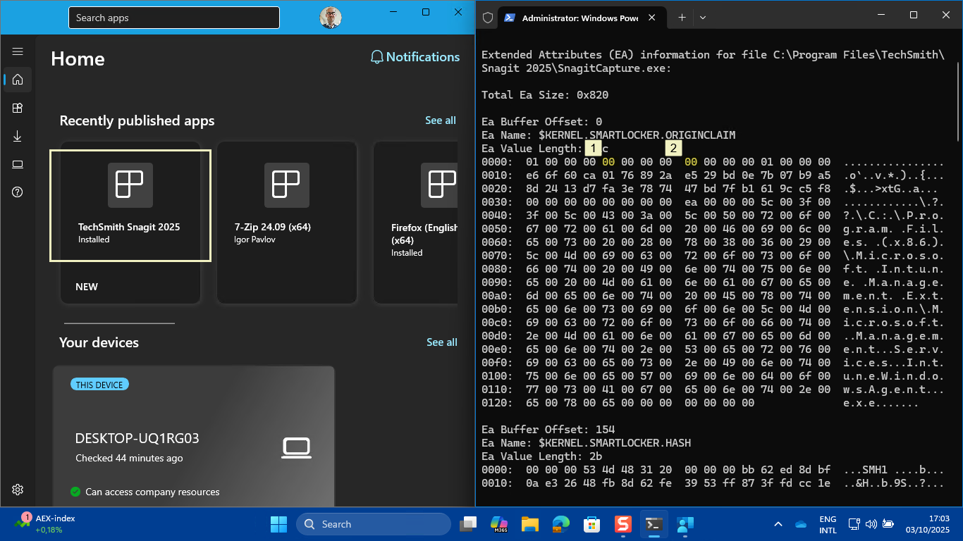 There are actually many different methods to verify the applied configuration. The most direct method is the method documented here by Microsoft. IT administrators can use fsutil.exe to determine whether a file was created by a managed installer process. That is exactly what the Intune Management Extension will be after applying the earlier mentioned configuration. So, when installing an app via Microsoft Intune, using the Intune Management Extension, the installed app will be tagged as being created by a managed installer process. That verification can be done by actually querying extended attributes on a file using fsutil.exe. As a starting point, below on the left in Figure 3, is the successful installation of Snagit 2025.