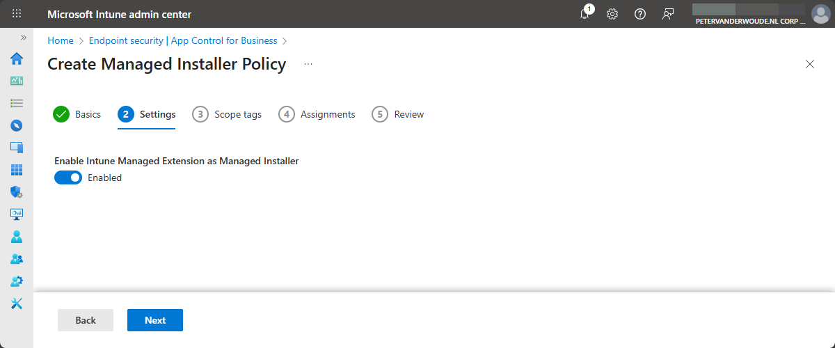 - On the Settings page, as shown in Figure 1, switch the slider with Enable Intune Management Extension as Managed Installer to Enabled and click Next