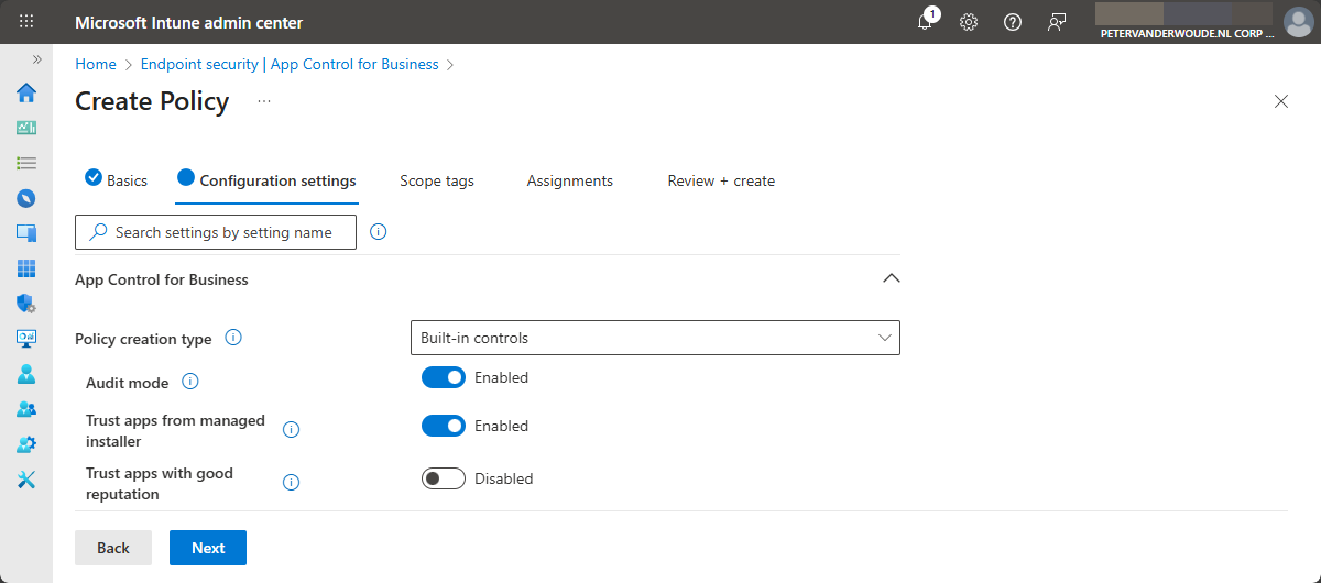 After making sure that the Intune Management Extension is configured as a managed installer, the next step is actually taking advantage of that. For that purpose, Microsoft Intune has the App Control for Business policies. Those policies rely on the ApplicationControl CSP and are available via the Endpoint security node within Microsoft Intune. And those policies can be used to easily manage which apps are allowed to run on the managed Windows devices. Any apps that aren’t explicitly allowed to run, are blocked from running. For testing purposes, these policies can also run in audit mode. With audit mode enabled in the policy, the policy allows all apps to run and logs the details in the Event Viewer.