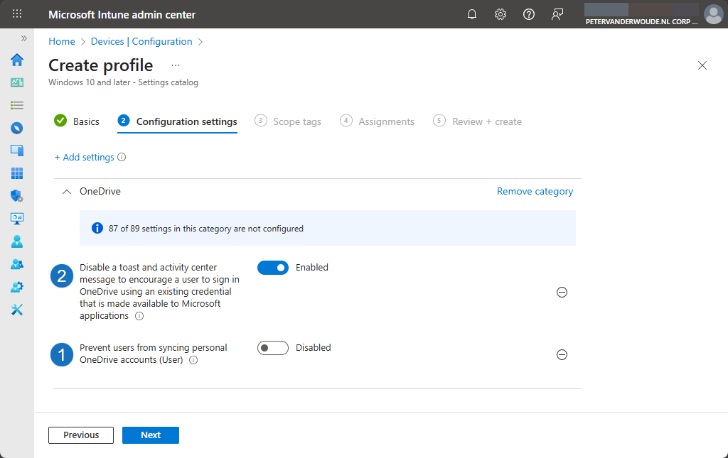 The configuration of those settings is actually pretty straightforward when using Microsoft Intune. Mainly because the configuration can now be managed via the Settings Catalog. The Settings Catalog contains nearly all ADMX-backed settings for OneDrive and those settings are backed by the OneDrive.admx. As an IT administrator these settings are now only a few clicks away and don’t require any really challenging configurations anymore. The following 8 steps can be used to configure the usage of personal Microsoft accounts with the OneDrive app, by using Settings Catalog.