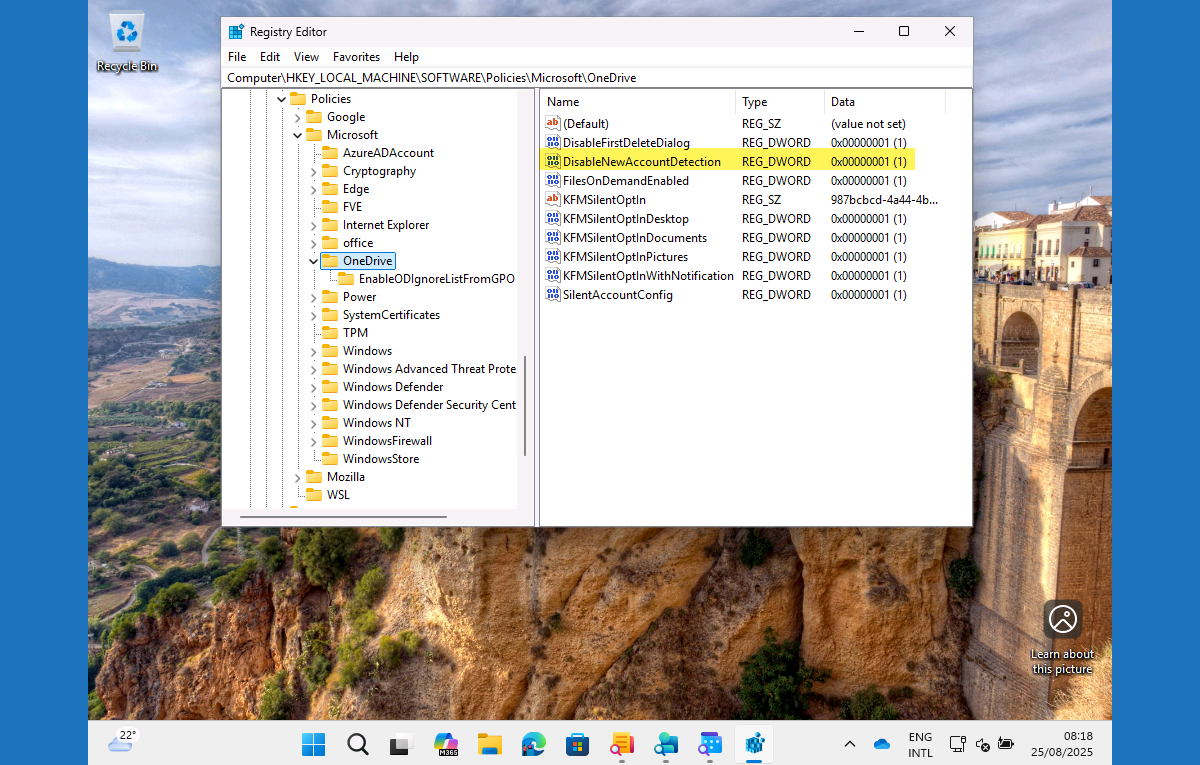 After applying the configuration, it is pretty straightforward to verify the behavior. Especially when specifically looking at the configuration of personal Microsoft accounts in the OneDrive app. The newer setting related to the prompt for the user, however, is not that easy to replicate. The easiest method will be to just verify the configuration within the registry, as all the settings related to OneDrive are backed by ADMX-files. Below in Figure 2 is an overview the applied configuration in the Registry Editor. That provides an overview of the applied configuration via the specified configurations in Microsoft Intune. In this case it is highlighting the new setting related to the new user prompt (DisableNewAccountDetection). Besides that, the configuration related to blocking personal accounts is a user setting and will be shown in the user policy keys.