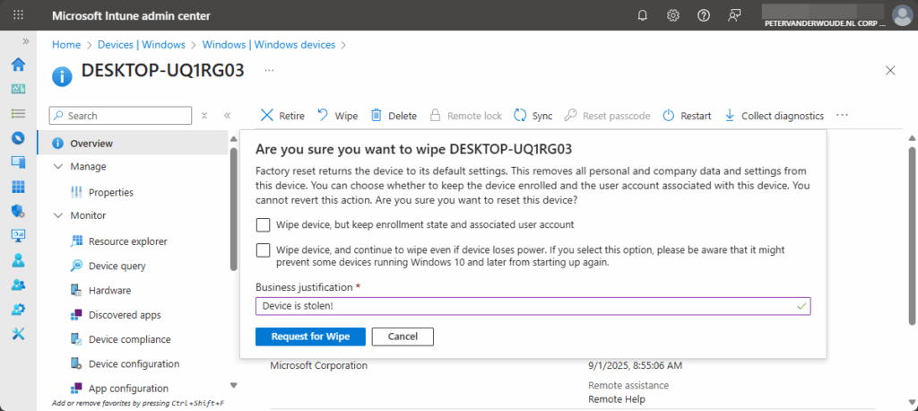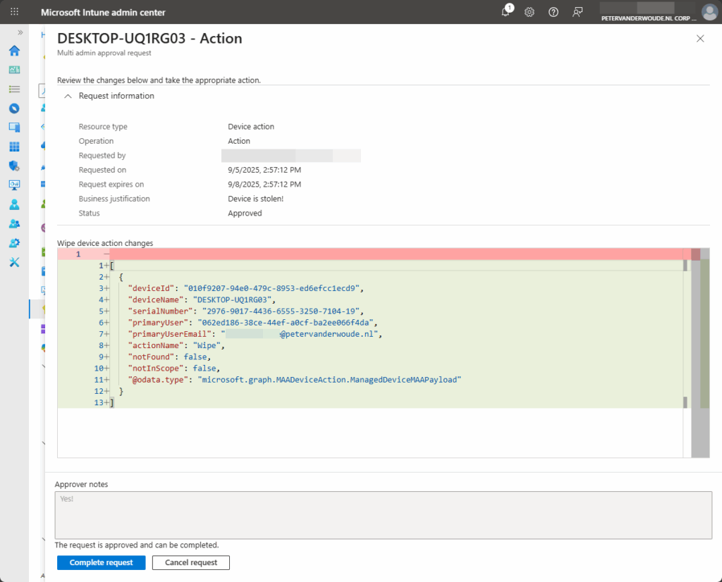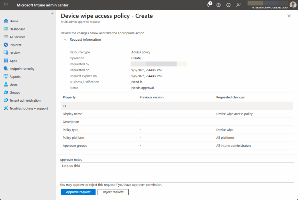 This week is all about the preventing accidental device wipes by using multiple administrative approval in Microsoft Intune. Multiple administrative approval on itself is nothing new, but the latest addition to that functionality makes it a lot more powerful. Before, multiple administrative approval was mainly focused adding apps and scripts to Microsoft Intune. Nowadays, multiple administrative approval can also be used for Intune roles and the most critical device actions. Those device actions include device wipe, device retire, and device delete. With those device actions, there will be a little safety net for IT administrators when performing impactful device actions without really giving in on security. Multiple administrative approval will help with preventing accidentally wiping a device. Every device wipe will require an approval from another IT administrator, and only after that approval the action can be continued. This post will provide more information, the configuration, and the experience.