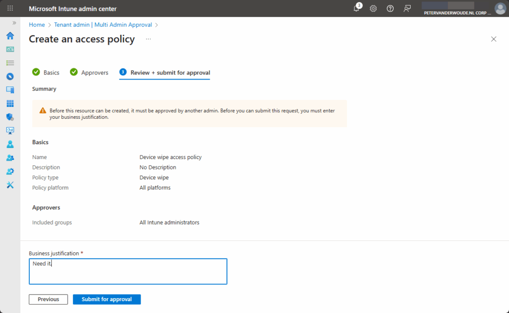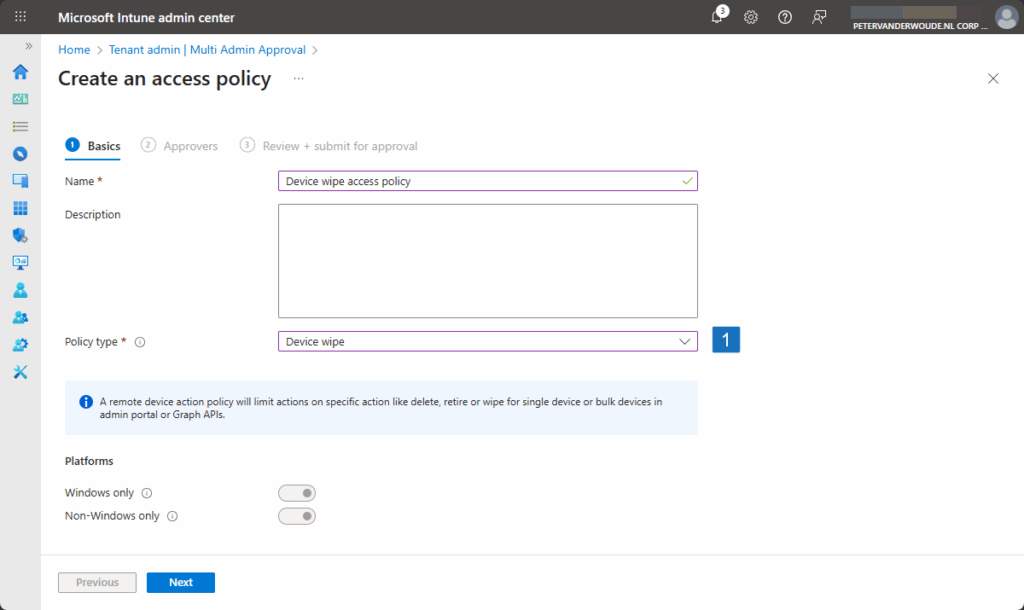 When looking at multiple administrative approval, it always starts with an access policy. The access policy is used to specify the profile types that are protected – in this case the device wipe action – and the Entra security group that contains the administrative users for the additional approval. After configuring that policy, any administrator account that is used to perform a device wipe will require an explicit approval from a different administrative account. On top of that, the configuration of that policy also nowadays already requires multiple administrative approval. The following six steps walk through the creation of the first stage of an access policy that is used to protect device wipes. Similar steps can be used to protect other profile types.