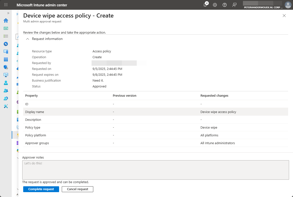 - On the Access policies tab, as shown in Figure 7, select the just approved multi admin approval request for the device wipe action and click Complete request