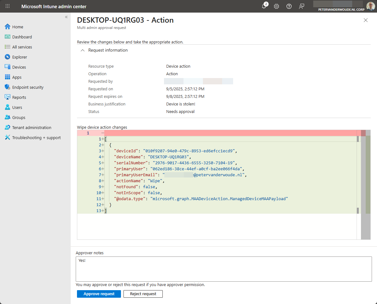 This week is all about the preventing accidental device wipes by using multiple administrative approval in Microsoft Intune. Multiple administrative approval on itself is nothing new, but the latest addition to that functionality makes it a lot more powerful. Before, multiple administrative approval was mainly focused adding apps and scripts to Microsoft Intune. Nowadays, multiple administrative approval can also be used for Intune roles and the most critical device actions. Those device actions include device wipe, device retire, and device delete. With those device actions, there will be a little safety net for IT administrators when performing impactful device actions without really giving in on security. Multiple administrative approval will help with preventing accidentally wiping a device. Every device wipe will require an approval from another IT administrator, and only after that approval the action can be continued. This post will provide more information, the configuration, and the experience.