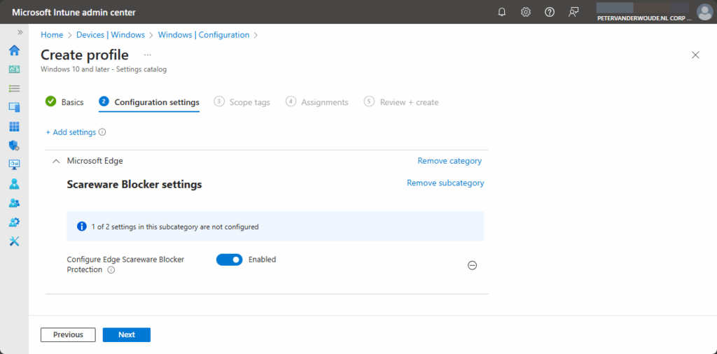 After being familiar with the main configuration options for configuring scareware blocker in Microsoft Edge, it’s time to have a look at the configuration itself. The described setting for managing scareware blocker in Microsoft Edge are available within the Settings Catalog in Microsoft Intune. The Settings Catalog nowadays contains the latest settings related to Microsoft Edge. The following 8 steps can be used to enable the scareware blocker in Microsoft Edge, by using Settings Catalog.