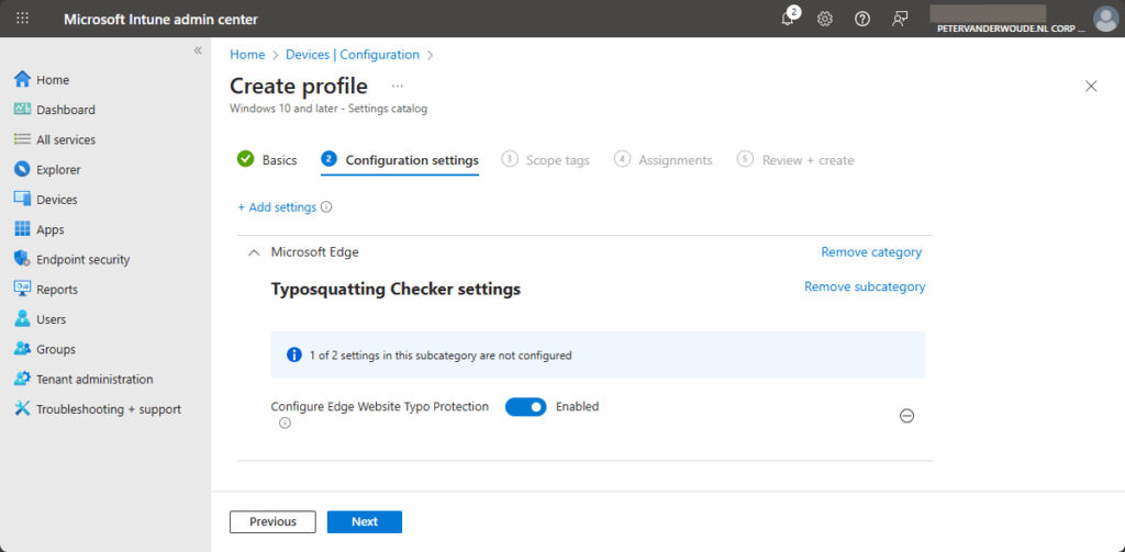 The configuration of website typo protection in Microsoft Edge is actually pretty straightforward when using Microsoft Intune. The configuration can be managed via the Settings Catalog. The Settings Catalog contains ADMX-backed settings for Microsoft Edge. Those settings are backed by the MSEdge.admx. The main setting itself is TyposquattingCheckerEnabled with Configure Edge Website Typo Protection as friendly name. As an IT administrator this setting is only a few clicks away nowadays and doesn’t require any really challenging configurations anymore. The following 8 steps can be used to enable and enforce website typo protection, by using Settings Catalog.