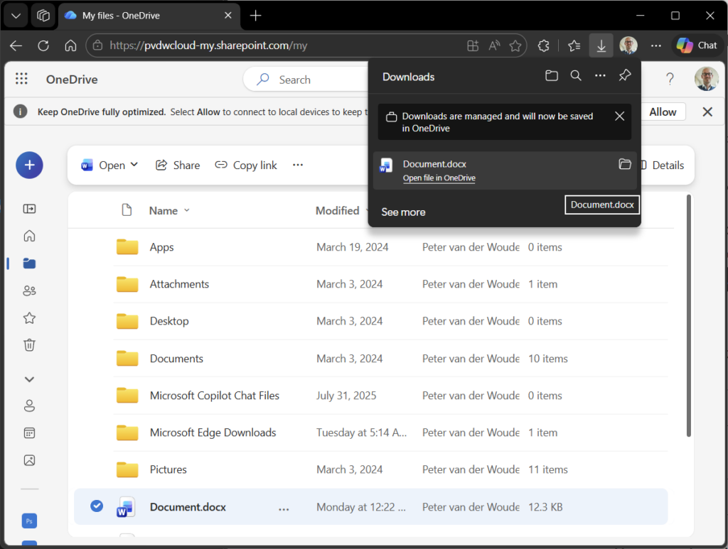 This week is all about a combination of new features. That combination of features is allowing MAM enrollment on managed Windows devices and protecting downloads in Microsoft Edge. Both features are relatively new features in Microsoft Edge, that are both currently still behind experimental feature flags. The first feature enables MAM enrollment on managed devices (also known as cross-tenant support) and the second feature protects the downloads in Microsoft Edge in that scenario. That feature makes sure that downloads are always redirected to a folder that is managed within the home tenant of the user account and that enforces organizational compliance. In practice that means that when the user downloads files, in that MAM enrolled profile on a device that is already managed by another organization device, the downloaded files are redirected to a new folder named Microsoft Edge Downloads in the OneDrive for Business of that user that belongs to that MAM enrolled profile. That makes sure that all the downloads are protected when being performed through the managed browser, and also that no data will be leaked to the already managed device. Protected downloads is part of the set of relatively new data protection features in Microsoft Edge. This post will provide a closer look on both features, the configuration, and the user experience.