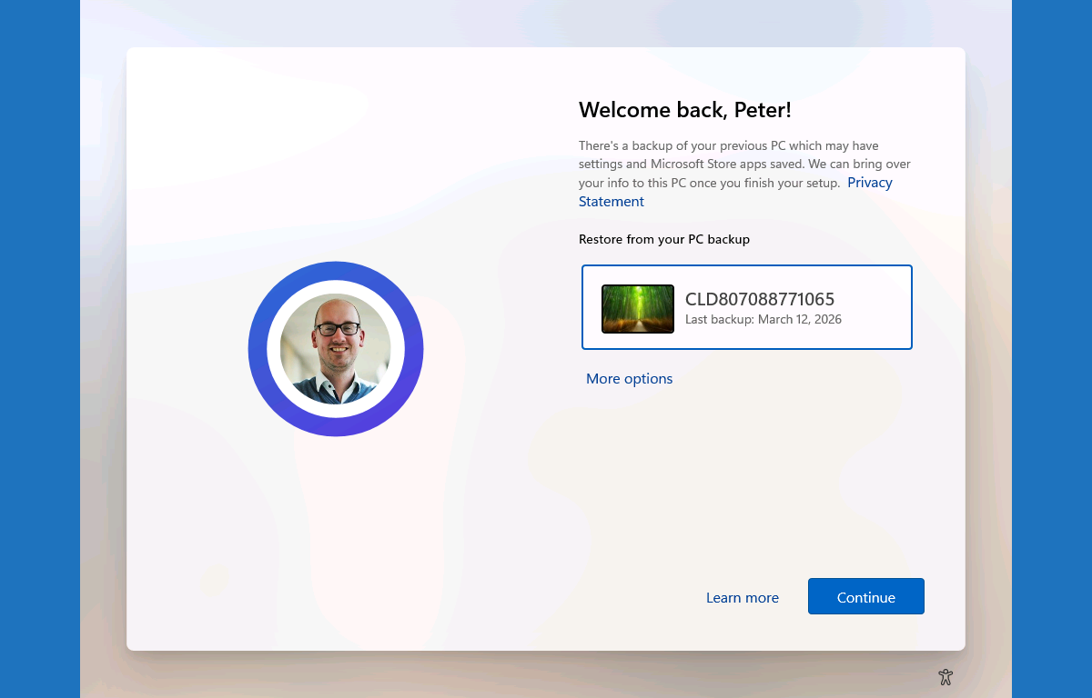 This post is deliberately discussing the Windows Backup and Restore functionality, as there is no restore functionality without having a backup first. The focus, however, will be on the restore functionality, as that is the new functionality. When looking at the restore during first sign-in requirements, the device must be running Windows 11, version version 24H2, or version 25H2, with at least the security update of March 2026. On top of that, the user must have at least one backup available, and the device must be Entra joined. When that is all in place, the user can sign-in for the first time after enrollment.