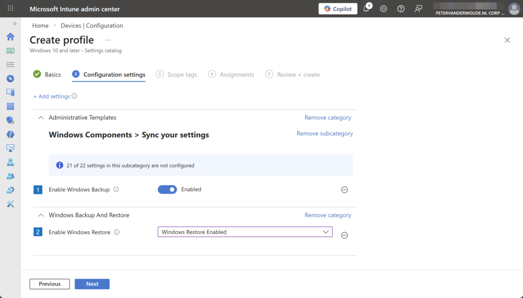 When the requirements are applicable to the environment, a single configuration can be used for enabling the Windows Backup and the Windows Restore functionality. Luckily, those configurations are already available as settings within the Settings Catalog. Those settings are EnableWindowsBackup, with the friendly name of Enable Windows Backup, and EnableWindowsRestore, with the friendly name of Enable Windows Restore, and both are part of the SettingSync.admx. In other words, both settings are ADMX-backed settings. That same ADMX-file also contains more detailed settings related to the categories of settings that should be part of the backup. For a complete overview of those settings see the documentation. Eventually, the configuration is pretty straightforward, as all settings are available within the same category within the Settings Catalog. The following eight steps walk through the process of simply enabling the Windows Backup and the Windows Restore functionality.