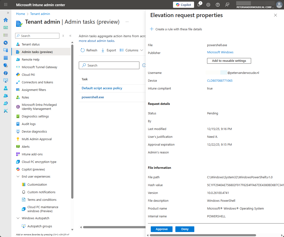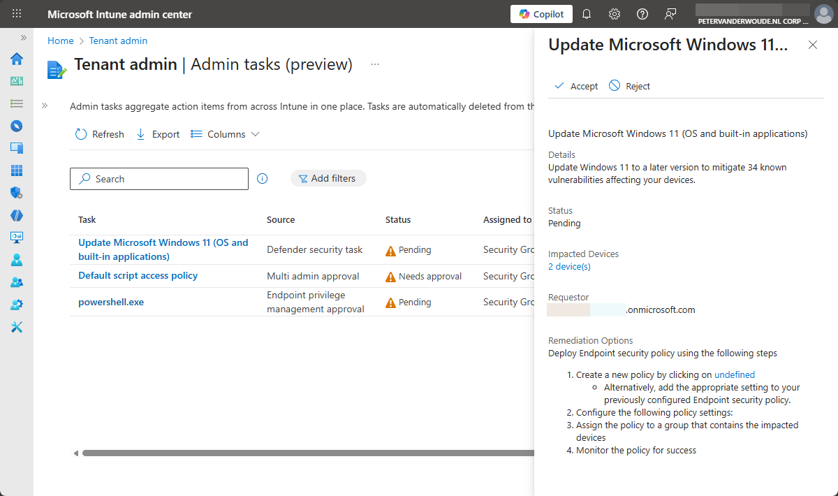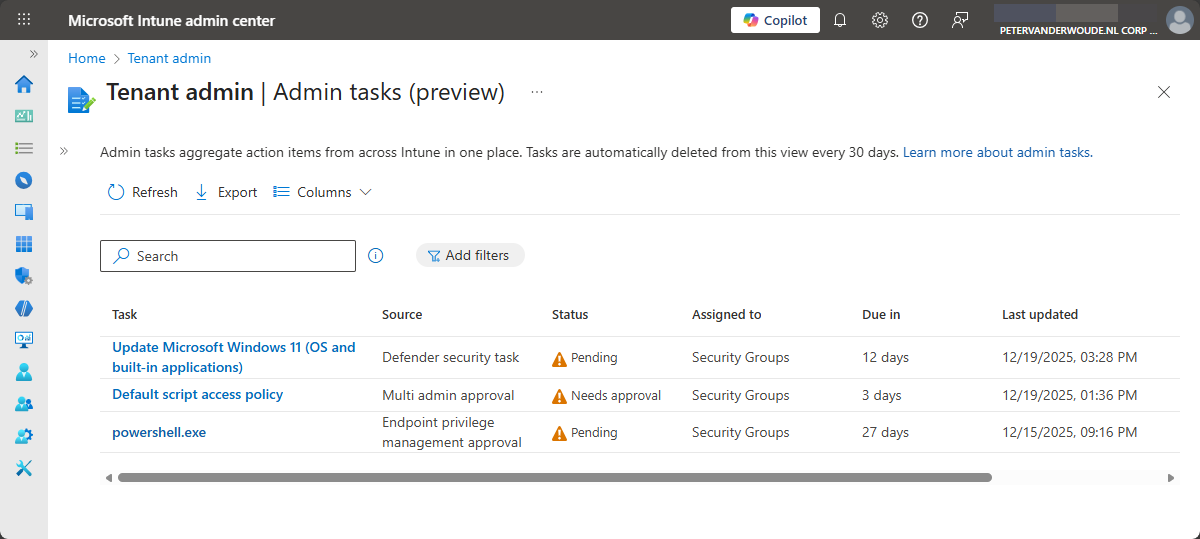 This week is all about the recently newly introduced admin tasks node in the Microsoft Intune admin center. That node provides a centralized view for many different types of administrative tasks. The idea behind that node is to provide a unified experience that helps IT administrators with focusing on the tasks that really matter without navigating through all different nodes within Microsoft Intune admin center. The admin tasks node now provides an overview of all the different security tasks, user elevation requests, and admin approvals request. That further simplifies the life of an IT administrator, when using Microsoft Intune. And the best part of it: it only shows the administrative tasks that the IT administrator is allowed to see based on the original source node. This post will provide a closer at this new experience and what to expect.