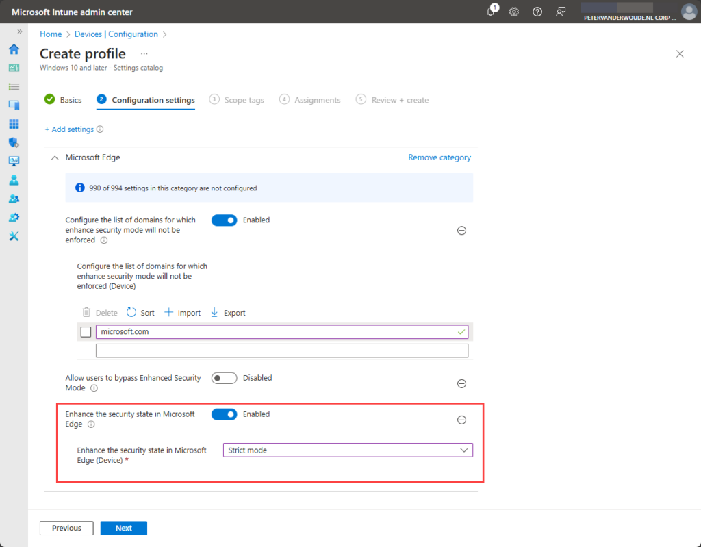 After being familiar with Enhanced Security Mode in Microsoft Edge, and the different configuration options, it’s time to look at actually configuring it by using Microsoft Intune. The good news is that the configuration can be managed via the Settings Catalog. The Settings Catalog contains ADMX-backed settings for Microsoft Edge. Those settings are backed by the MSEdge.admx. The main setting itself is EnhanceSecurityMode with Enhance the security state in Microsoft Edge as friendly name. As an IT administrator this setting is only a few clicks away nowadays and doesn’t require any really challenging configurations anymore. The following 8 steps can be used to enable Enhanced Security Mode, by using Settings Catalog.