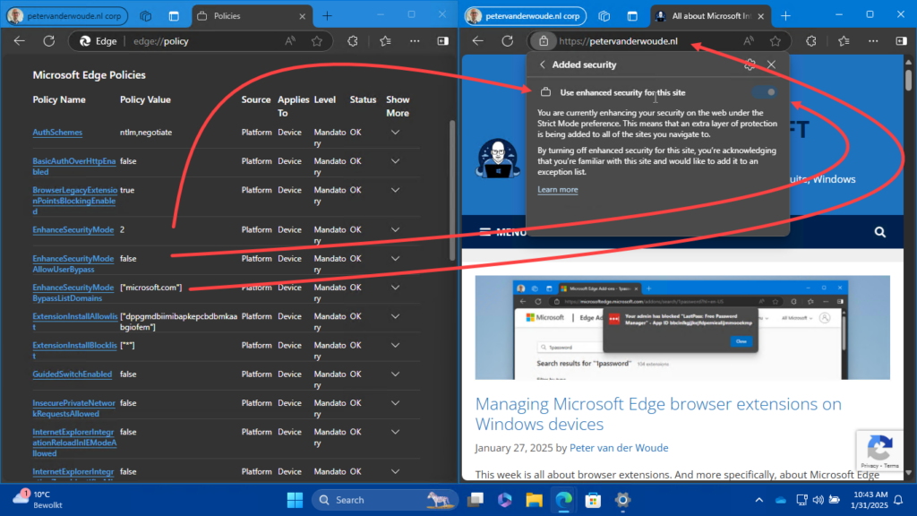 This week is all about tightening security in Microsoft Edge and making sure that it’s one step closer to a secure enterprise browser. Especially nowadays when users spends most of their time in a web browser, it’s important to make sure that the right controls are in place to protect the users and the corporate data. That can be achieved by having a closer look at the different security features that Microsoft Edge brings to the table. And that are many different features. When specifically looking at protecting the user, think about features like Microsoft Defender SmartScreen, typosquatting protection, and Enhanced Security Mode. Three different security features, all with their own focus. Microsoft Defender SmartScreen to protect against phishing and malware, typosquatting protection to warn users when mistyping a commonly used website name, and Enhanced Security Mode to protect against memory-related vulnerabilities. Especially the latter security feature is often overlooked and deserves some extra attention. This post will start with a brief introduction, followed with the configuration and the user experience.