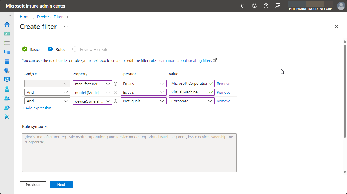 After being familiar with the properties that are supported with enrollment restrictions, it’s time to look at creating a filter specifically for those enrollment restrictions. That filter can only be used as an include on the enrollment restriction, which is important to keep in mind. The following five steps walks through the process of creating such a filter for non-corporate VMs.