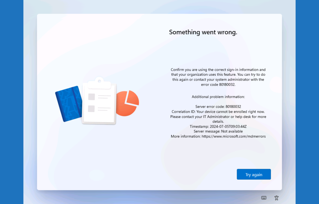 When the configuration of the enrollment restrictions for Windows devices is in place, it’s time to look at the experience. From a user perspective that experience is pretty straight forward. Simply go through the out-of-box experience and try to enroll the, in this case, unregistered VM in Hyper-V. That directly provides an 80180032 error code, as shown below in Figure 3, which refers to the platform being blocked by enrollment restrictions.