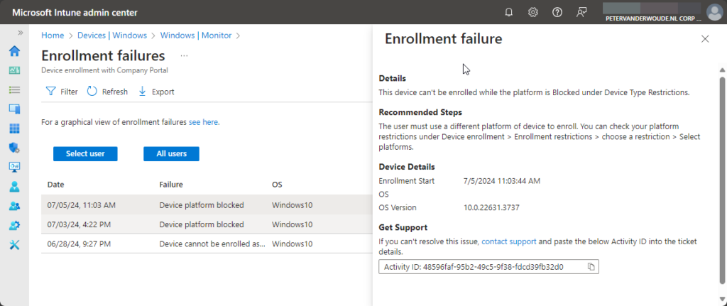 The other place that provides an overview of that experience is the Enrollment failures report. That report, as shown below in Figure 4, provides an easy overview of the enrollment failures. Simply select the line of the specific device and it clearly shows the status that the enrollment failed due to the device platform being blocked.
