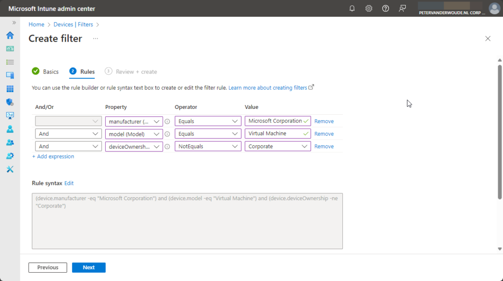 After being familiar with the properties that are supported with enrollment restrictions, it’s time to look at creating a filter specifically for those enrollment restrictions. That filter can only be used as an include on the enrollment restriction, which is important to keep in mind. The following five steps walks through the process of creating such a filter for non-corporate VMs.